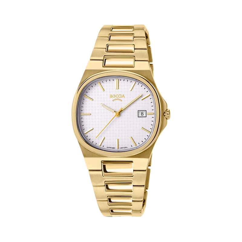Boccia Titan 3348-02 er en elegant dameklokke i lett titan med gullfarget belegg. Den hvite urskiven har datovisning ved klokken tre og sølvgrå rutenettstruktur som gir et moderne preg. Klokken drives av et presist quartz-verk og er beskyttet med mineralglass. En tidløs modell som kombinerer komfort med stil.