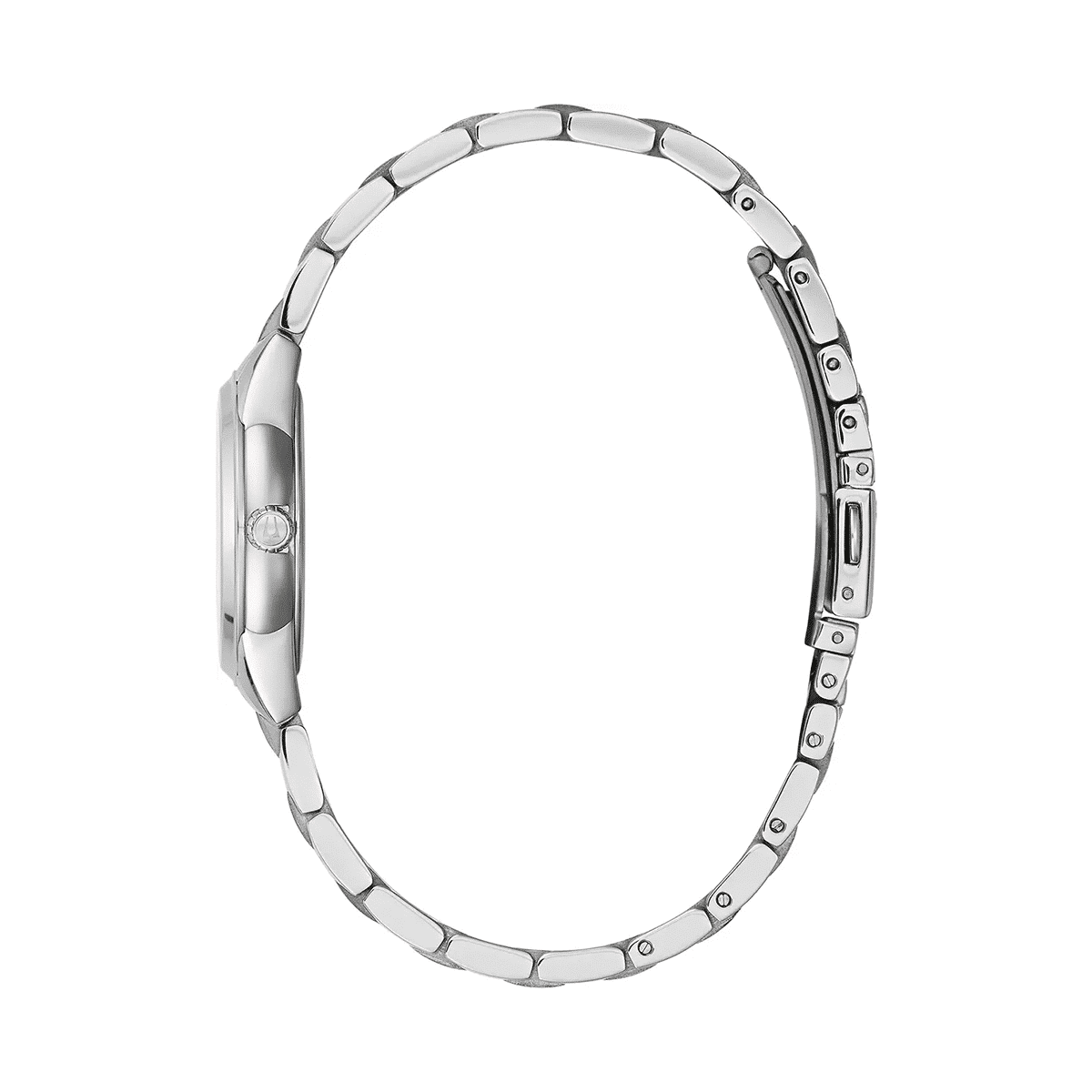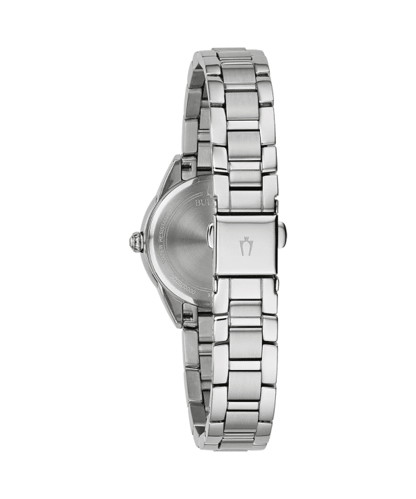 Bulova dameklokke 96P249 med rosa skive, diamantmarkører og kvartsverk. En elegant og feminin klokke med lenke i rustfritt stål.