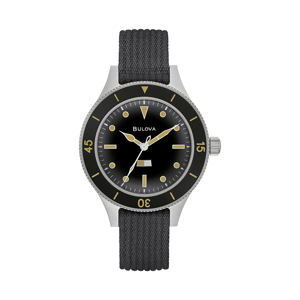 Bulova herreklokke 98A266 med automatisk urverk, sort skive og svart tekstilrem. Limited edition-modell inspirert av militære dykkerklokker fra 1950-tallet.