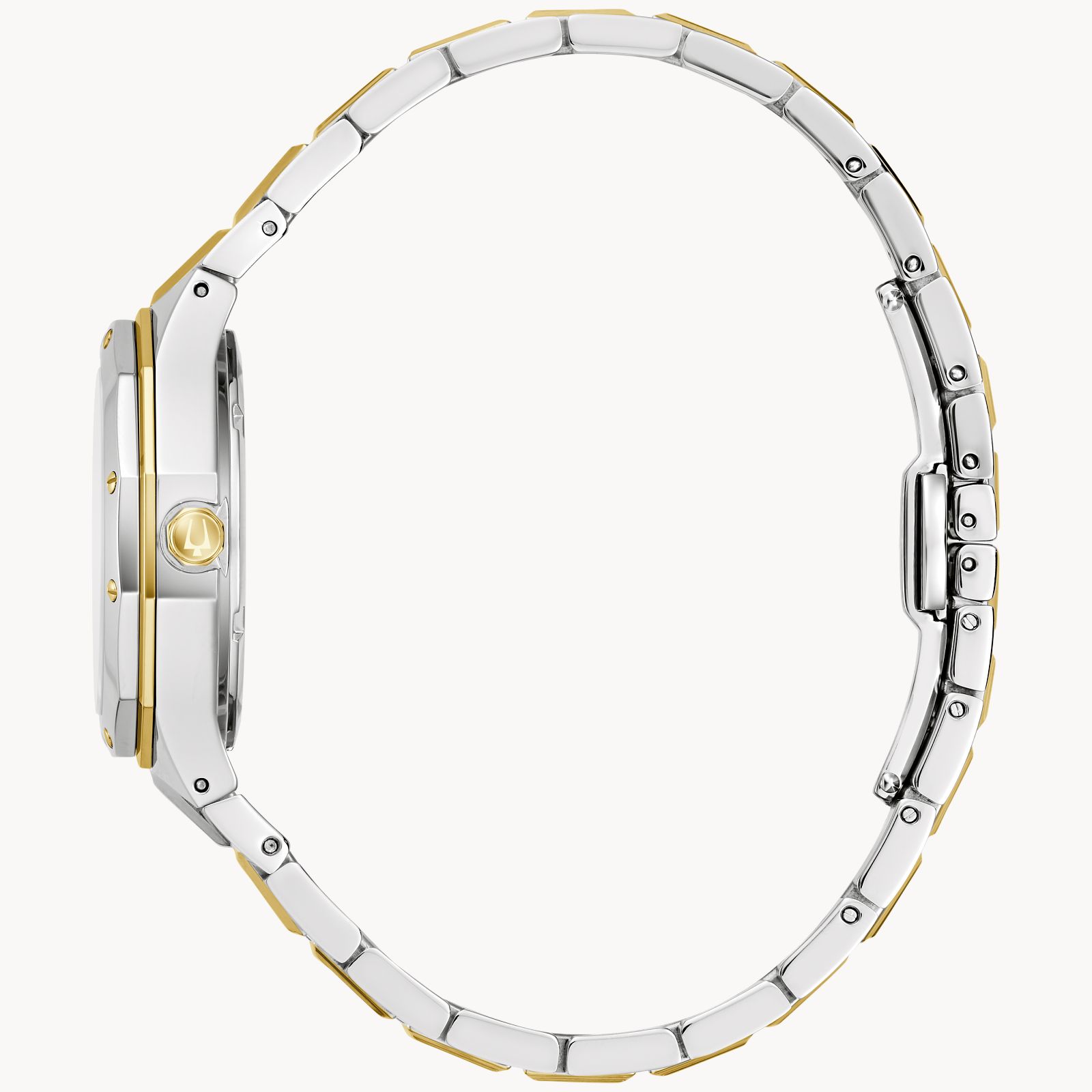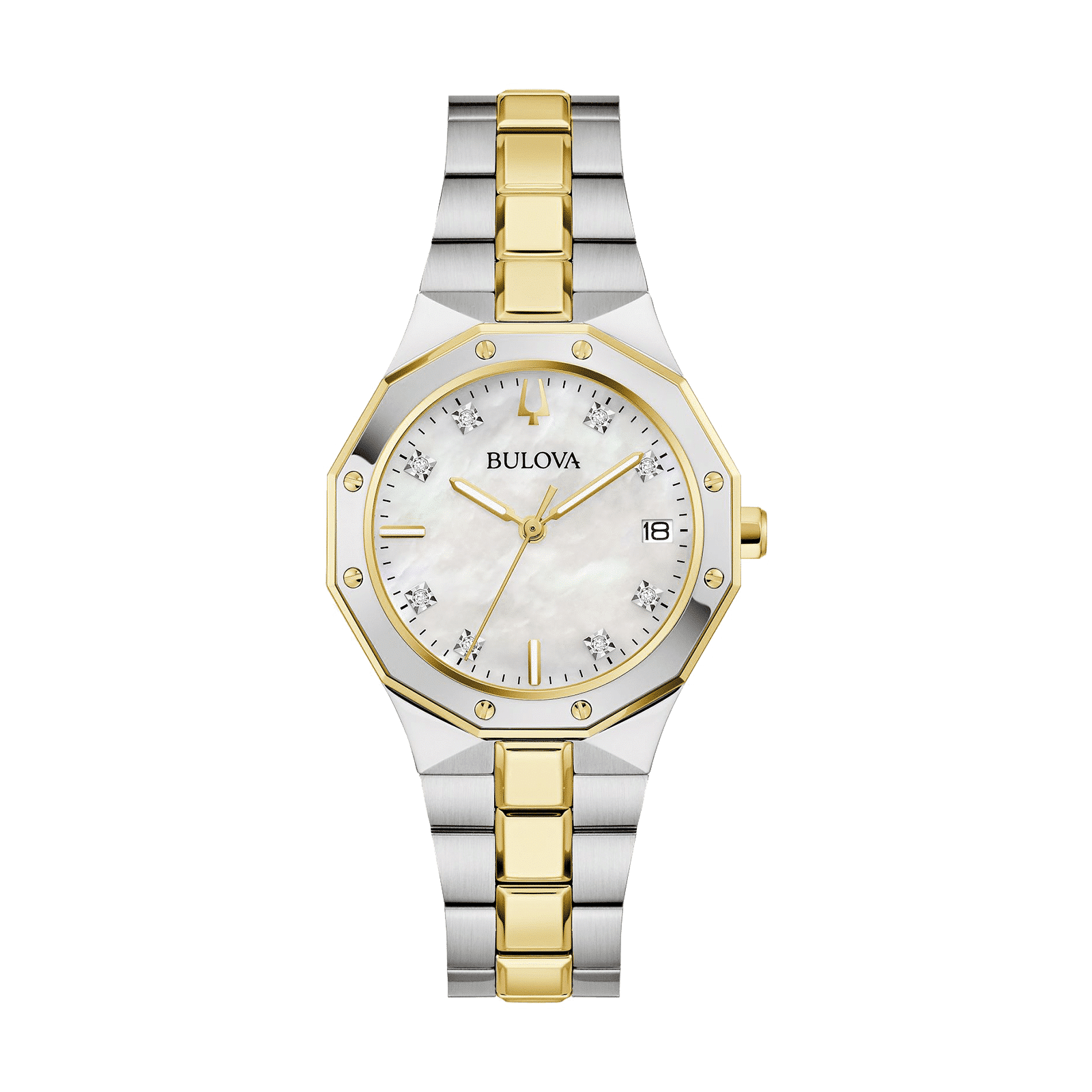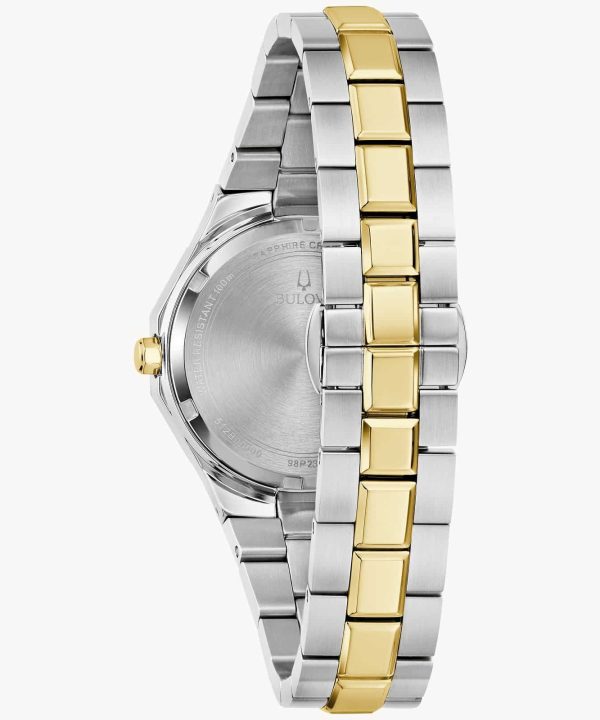 Bulova dameklokke 98P234 med perlemorskive, diamantdetaljer og tofarget lenke. Elegant og moderne design med kvartsverk og datovisning.