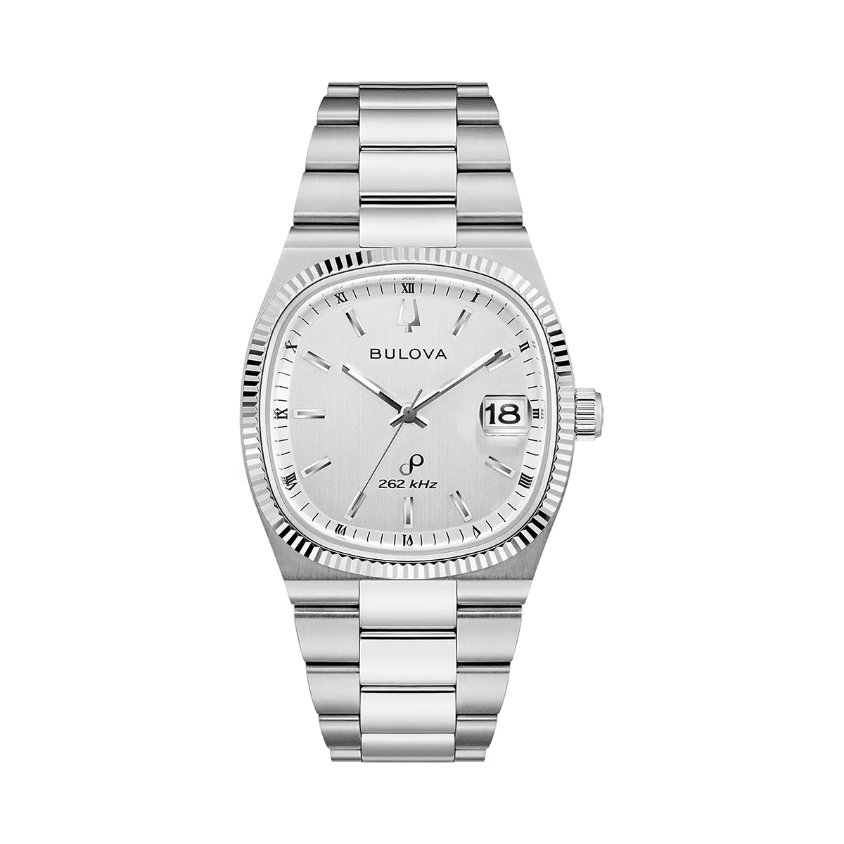 Den sølvfargede skiven har en vertikal børstet finish, sølvfargede visere og indeksmarkører, samt et datovindu ved klokken 3. Klokken drives av Bulovas egen høyfrekvente Precisionist quartz-urverk, som vibrerer ved 262 kHz og gir en presisjon på sekunder per år.