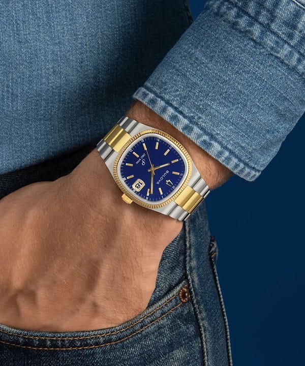 Bulova Super Seville 37.5 mm – 98B462 kombinerer blå skive, gullfarget riflet bezel og to tonet lenke i et klassisk og selvsikkert design. Klokken har presist quartz urverk, safirglass og en størrelse som sitter behagelig på håndleddet. Et godt valg for deg som ønsker en klokke med tydelig retrofølelse og moderne kvalitet.