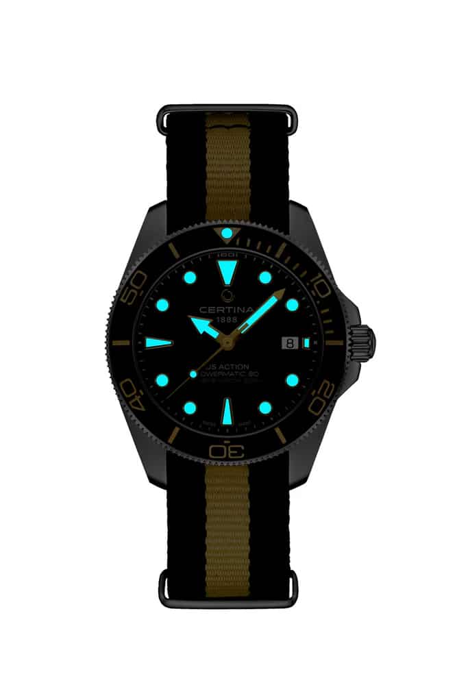 Certina herreklokke C048.407.18.051.01 med sort skive, automatisk urverk og tofarget NATO-rem. En lett, robust og vanntett dykkerklokke med Powermatic 80 og 300 meters sertifisering.