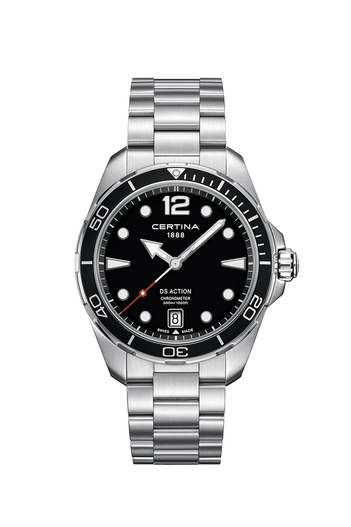Certina DS Action C032.451.11.057.00 er en sporty og presis herreklokke med sort tallskive, 300 meters vanntetthet og Precidrive quartzverk. En slitesterk dykkerklokke med høy komfort og sveitsisk kvalitet.
