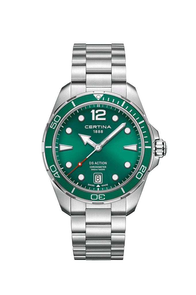 Certina DS Action C032.451.11.097.00 er en sporty og robust herreklokke med grønn sunray-skive, stållenke og sveitsisk presisjon. Med 300 meters vanntetthet er den ideell for både hverdagsbruk og eventyr.