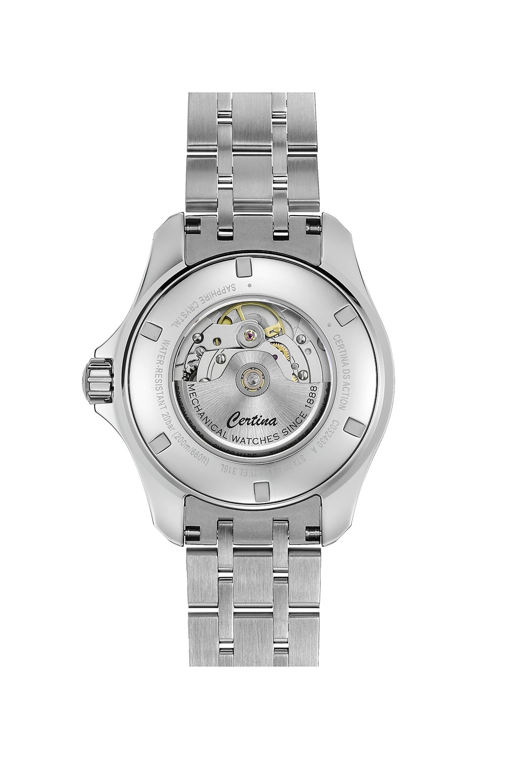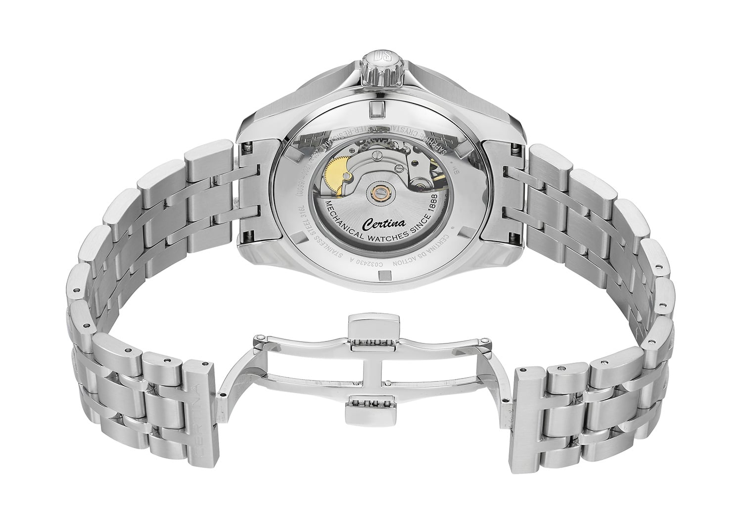 Certina herreklokke C032.430.11.081.01 med grå skive, dag og datovisning, automatisk Powermatic 80 verk og 200 meters vanntetthet. En sporty og funksjonell klokke i stål.