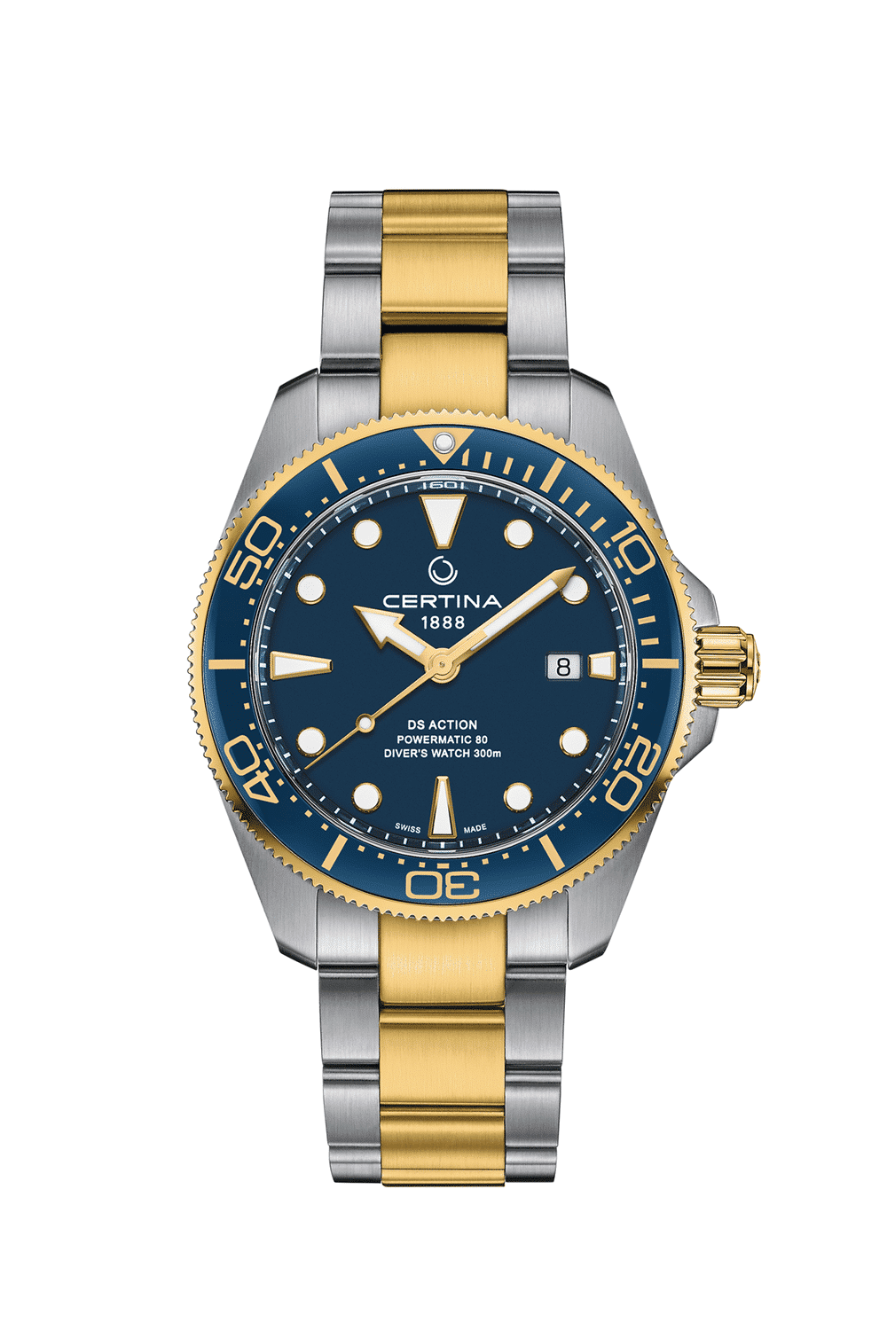 Certina DS Action Diver Powermatic 80 43mm – C032.607.22.041.00 er en kraftfull dykkerklokke med blå skive og to tonet utførelse i stål og gullfarge. Den har 300 meter vannmotstand, ISO sertifisering og automatisk Powermatic 80 urverk med lang gangreserve. En modell som kombinerer robust ytelse med et mer eksklusivt og iøynefallende uttrykk.