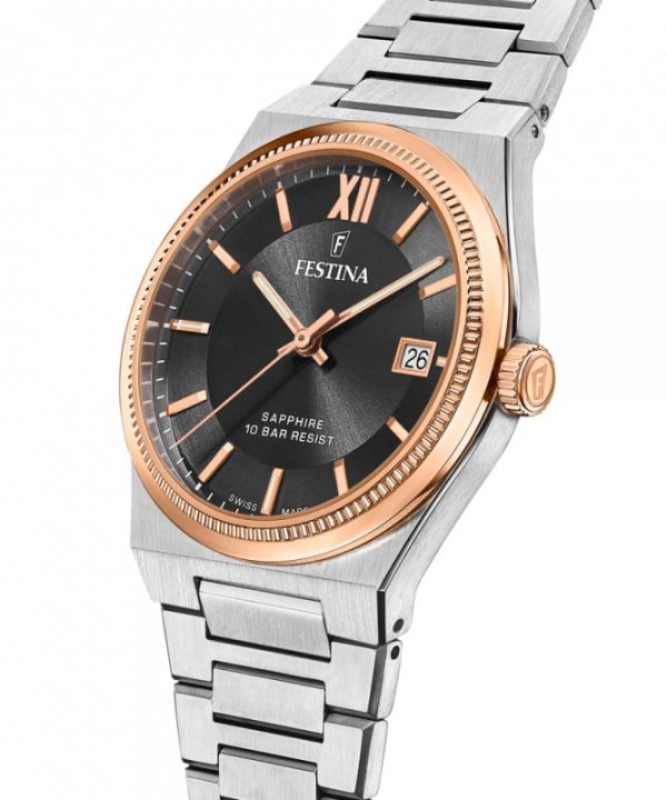 Festina Swiss Made Rivé Black F20036-3 er en sofistikert herreklokke i stål med roségullfarget bezel. Den sorte urskiven har romertall tolv, datovisning og safirglass. Vanntett til 100 meter og drevet av sveitsisk quartzverk. En tidløs modell som kombinerer eleganse og presisjon.