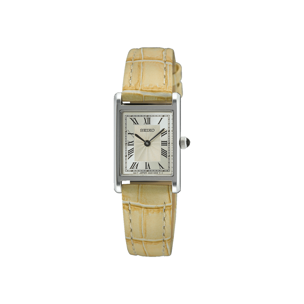Seiko Conceptual Ladies 20mm SWR095P1 er en elegant dameklokke med rektangulær kasse, romertall og lys gul skinnrem. Klokken har presist quartz urverk og safirglass som gir både komfort og holdbarhet i hverdagen.