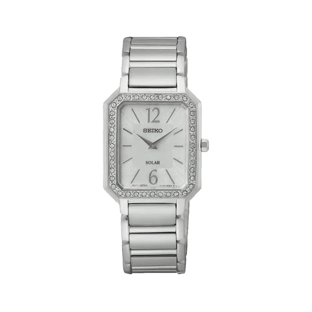 Seiko Ladies Classic – SUP465P1 er en elegant og tidløs dameklokke designet for deg som ønsker et raffinert uttrykk kombinert med moderne solcelleteknologi. Denne modellen har en rektangulær kasse som gir assosiasjoner til klassiske smykkeklokker, og den slanke profilen gjør at den passer både til hverdags og mer formelle anledninger. Det helsølvfargede designet gir et rent og sofistikert preg, og rammen rundt kassen er pyntet med klare stener som tilfører et subtilt og eksklusivt skinn uten å bli overdrevent.