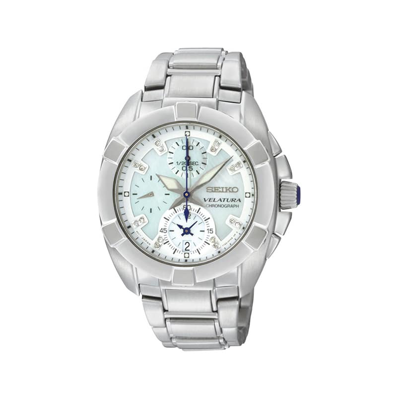 Seiko Velatura SNDZ19P1 er en sporty dameklokke med kronograf, perlemorskive og safirglass. En slitesterk og stilfull klokke med maritim inspirasjon.